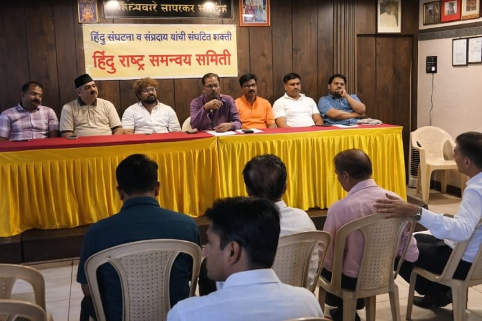From left: Suraj Kadam, Ajinkya Otari, Umesh Mahadik; Hemant Chalke (speaking), Anurag Utekar, Parag Oak, and Rajesh Otari.…