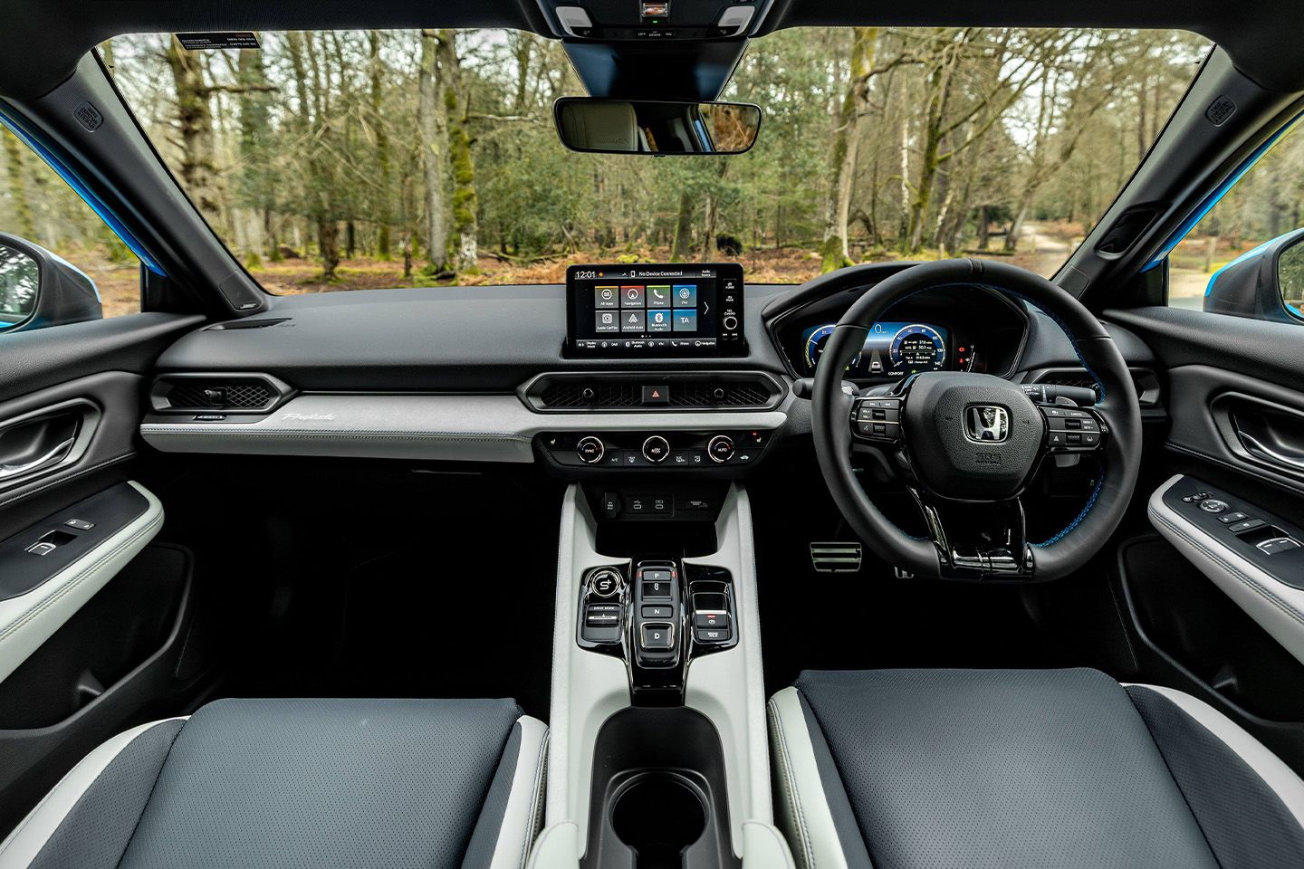 To reel you back in, Honda has included a clever new ’S+ Sport’ mode with its own dedicated button. Pressing it simulates a virtual eight-speed gearbox, meaning you get to flick the paddles on the back of the steering wheel to swap simulated cogs. Of course, all that’s happening in reality is that the combustion engine revs match the car’s speed, and you’re merely dropping those revs by pulling for another ‘gear’. But it’s certainly a welcome addition to proceedings, and the use of regen to give you a slight jolt with every shift is convincing enough if you’ve managed to suspend your disbelief.