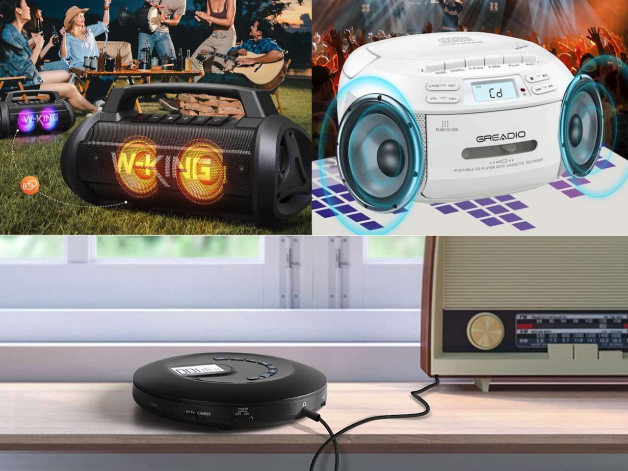Seven products, seven different ways to listen, and not a single one breaks the $100 barrier. The portable CD player brings physical media back to your commute. The Motion Boom and HD77 handle pools, rain, and trail dust without flinching. The D10 fills a backyard with 120 watts of clean, DSP-tuned sound. The Dprofy locks onto a golf cart and stays put over gravel. And the Retekess and Greadio boomboxes prove that CDs, cassettes, and Bluetooth can coexist in the same box without compromise.