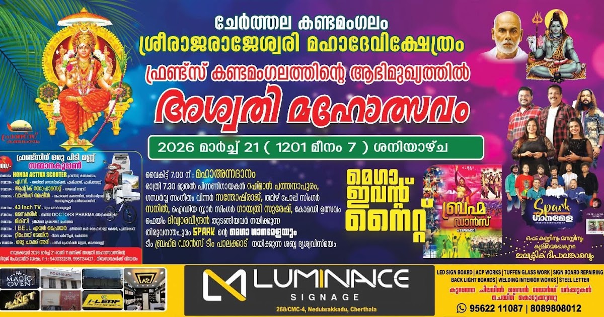 The sacred Ashwathi Mahotsavam 2026 at Cherthala Kandamangalam Sree Rajarajeshwari Mahadevi Temple promises an evening of devotion, celebration, and cultural brilliance. Organised under the auspices of Friends Kandamangalam, the festival will be held on Saturday, March 21, 2026 (Meenam 7, 1201 ME).