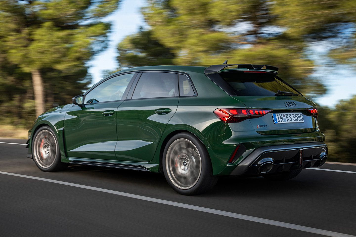 Being an Audi anniversary model means there’s an obligatory nod to one of its many legendary Quattros, though it’s clearly nowhere near as drastic as the GT50 concept’s IMSA-style makeover. Instead, the RS3 Competition Limited can be spec’d with the iconic Malachite Green paint originally found on the Sport Quattro, which looks especially good when paired up with the standard 19-inch Neodymium gold wheels, though less interesting Daytona Grey and Glacier White matte options can also be had. If that wasn’t enough, Audi has developed an exclusive new light signature where segments of the matrix LED headlights illuminate in a 1,2,4,5,3 pattern as a reference to the five-pot’s firing order.