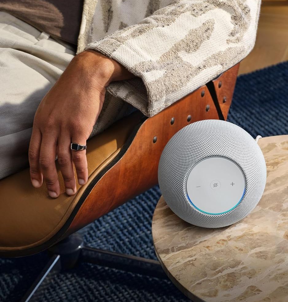 The Echo Studio has a smooth, spherical silhouette with subtle Amazon branding. The size remains moderate, larger than a standard Echo Dot but smaller than a traditional hi-fi speaker cabinet. Buttons on top control volume, action, and mic mute, and the light ring glows gently during interaction. The interface stays Alexa-centric: voice drives most functions, and the physical controls supplement without dominating.