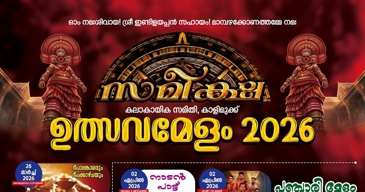 The Utsava Melam 2026 organized by Kalakaayika Samithi, Kalimukku will be celebrated with colorful cultural programs, traditional melam, deepalankaram, and temple festival events. The festival includes Deepakkazhcha, Panchari Melam, Kaikottikali, stage shows, and Pooram-style visual performances, making it one of the vibrant local celebrations of the year.