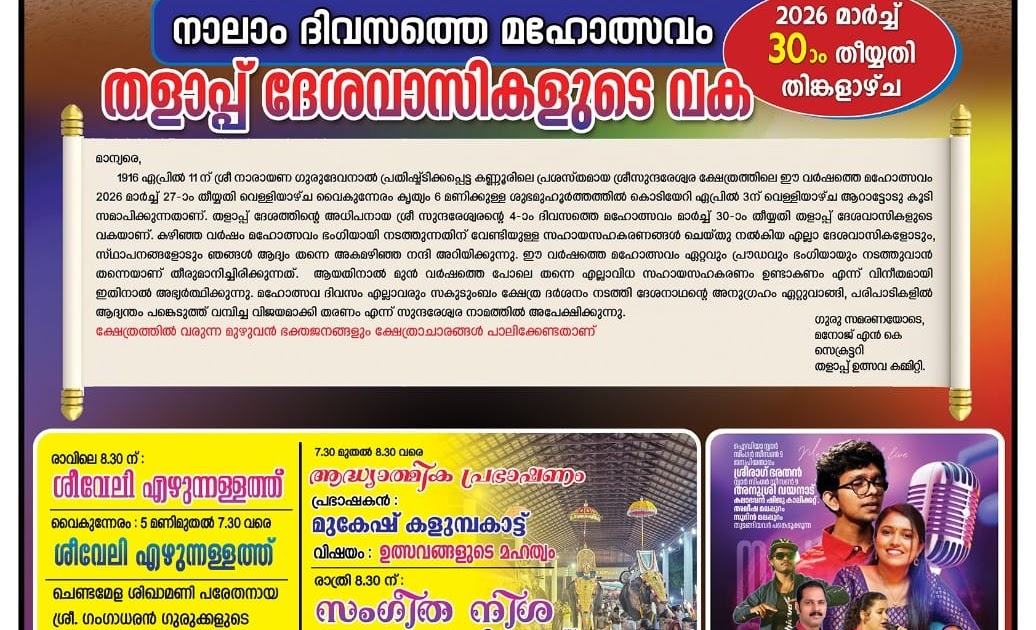The festival committee expresses sincere gratitude to all devotees, residents, and supporting institutions who contributed generously to the grand success of previous celebrations. With renewed enthusiasm, preparations are underway to make this year’s Mahotsavam even more magnificent. Devotees are warmly invited to participate wholeheartedly and extend their continued support.