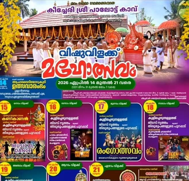 The Keechery Sree Paalottu Kavu Vishu Vilakku Mahotsavam 2026 promises a spiritually enriching and culturally vibrant experience. Devotees and visitors are invited to witness the rituals and celebrate the festive spirit with devotion and joy.