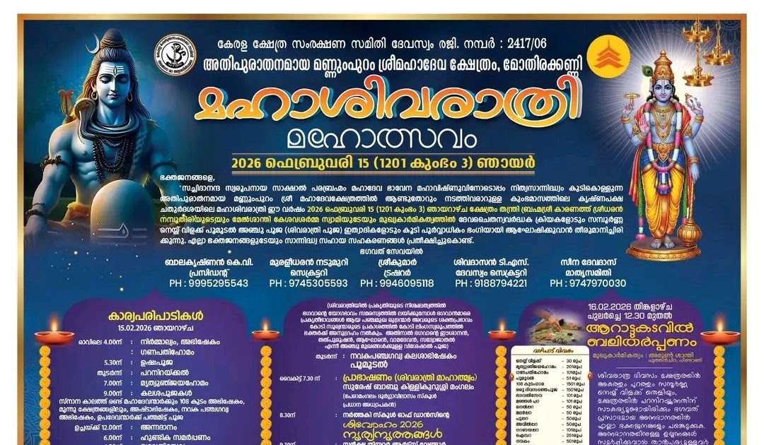 Maha Shivaratri, the most sacred night dedicated to Lord Shiva, will be celebrated with deep devotion and traditional sanctity at the Mannumpuram Sree Mahadeva Temple, Mothirakkanni on Sunday, February 15, 2026 (Malayalam Era 1201, Kumbham 3). Revered as an ancient temple where divine presence is believed to be eternally vibrant, Mannumpuram becomes a spiritual epicenter during this auspicious observance.