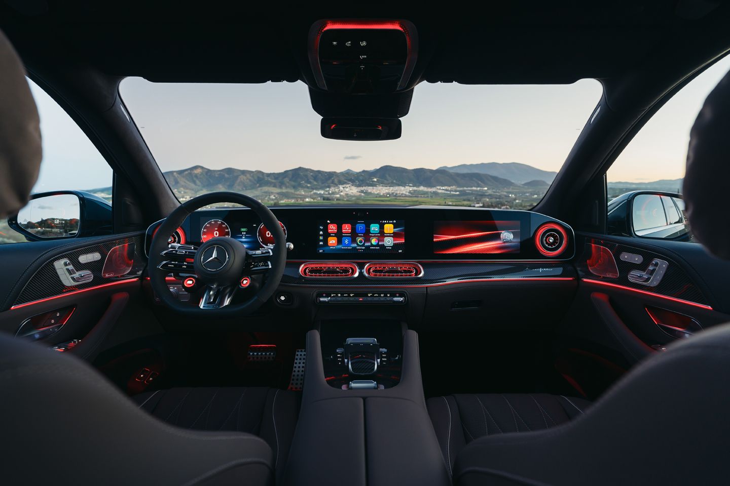 Speaking of which, there is a cosmetic overhaul, too – you may well have noticed Ireland Medium Green Metallic already. There’s also an AMG-specific grille to mark out both 53s from the rest of the GLE range, the star design lights and an AMG exhaust for ‘a more expressive presence.’ Plus there is a coupe version available for those who crave even more presence. Patagonia Red or Mystic Blue are also on the optional colour palette, with similar shades on offer for the interior alongside the near-obligatory carbon trim. Probably the biggest change for the GLE 53s inside is the return of a haptic rocker and roller for the Performance wheel; AMG’s steering circles can be really busy even at the best of times, so this sounds like a good move. Apparently the change is ‘fulfilling a frequently expressed customer wish’, so it’s not just a car writer whinge. The myriad displays feature an improved resolution.