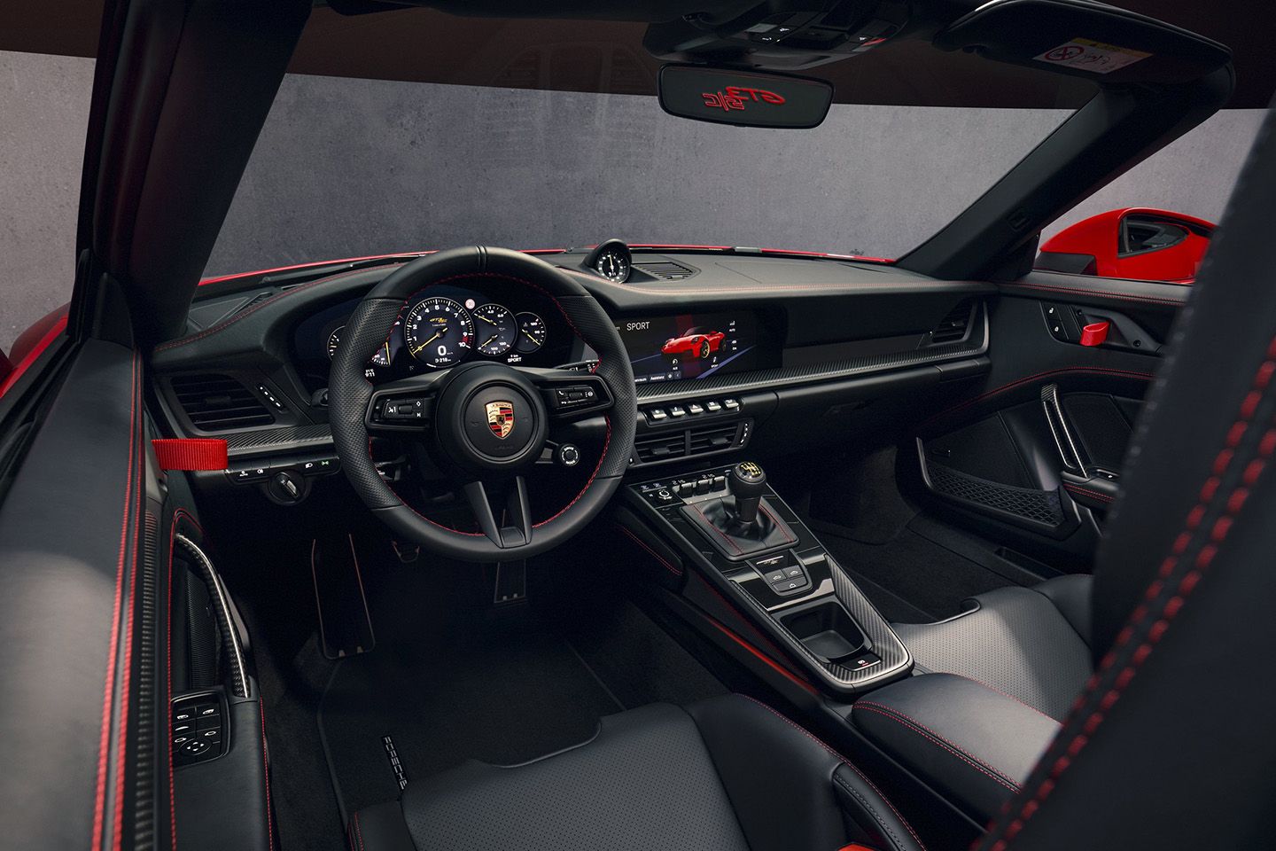 Up front, Porsche has developed a new set of optional carbon fibre bucket seats, specially designed with larger airbags on the outside bolsters to improve crash protection. The gear lever, meanwhile, is the shorter unit found on the 911 S/T, otherwise it’s standard 992 fare, much of which will depend on how many options you tick. If you’re feeling especially flush, Porsche’s offering a new ‘Street Style’ pack, which adds graphics down the sides and wings, plus an exceptionally jazzy interior with woven leather tartan. It’s a new technique for the company, and you’ll find it not only on the seats but in the glove compartment as well. Sir Jackie would be proud.