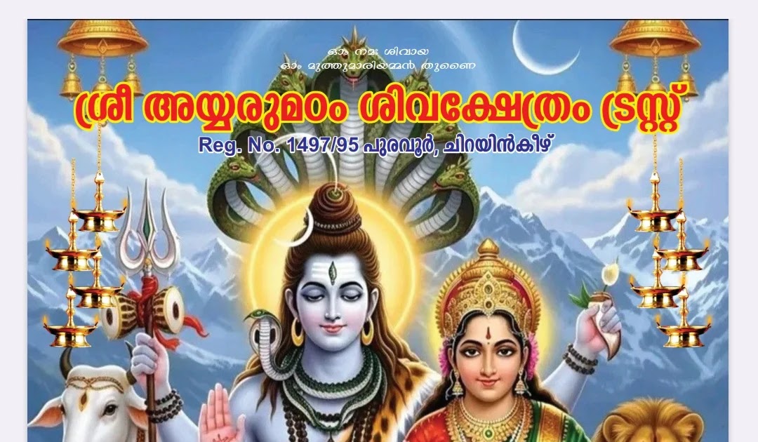 The sacred Shivaratri Mahotsavam and Amman Koda Festival 2026 will be observed with great devotion and traditional fervor from 9 February to 15 February 2026 at the revered Sree Ayyaramam Shiva Kshetram. This annual festival is one of the most spiritually significant events, drawing devotees from far and wide to participate in prayers, rituals, and cultural offerings dedicated to Lord Shiva and the Divine Mother (Amman).