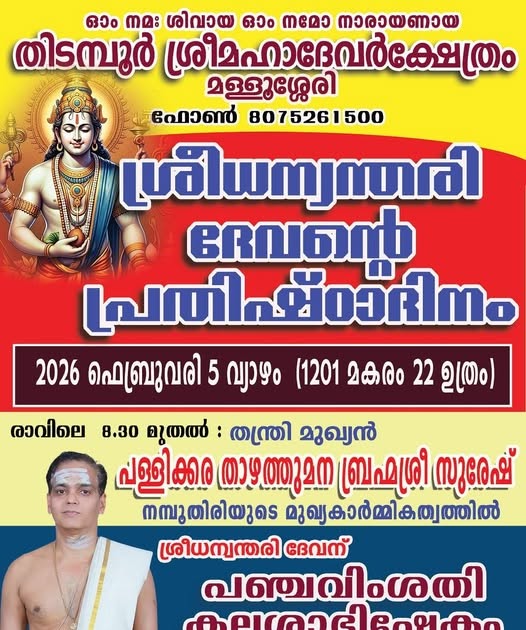 The Sree Dhanvantari Prathishta Dinam 2026 at Thidamboor Sree Mahadevar Temple is a sacred opportunity for devotees to seek divine healing and spiritual upliftment. Through powerful rituals like Panchavimsathi Kalasha Abhishekam, Dhanvantari Pooja, and Sopana Sangeetham, the temple offers a deeply enriching devotional experience.