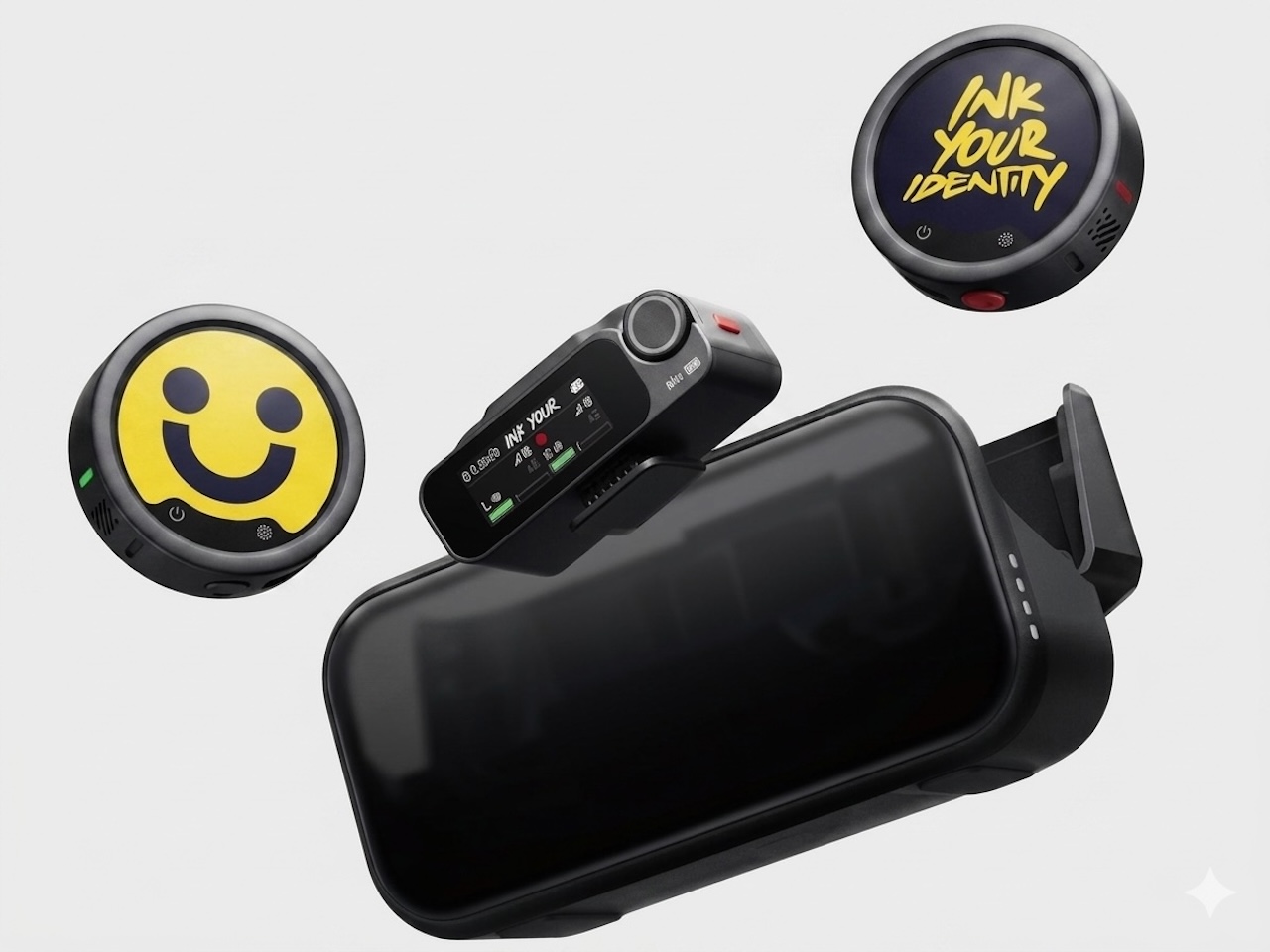 Most clip-on mics are built to disappear — tuck them under a collar, hope the fabric doesn’t rustle. Mic Pro goes the other way: a round, customizable color E-Ink display on each transmitter you can set with logos, names, photos, emojis, or artwork, so it’s something the camera sees on purpose. It’s a branding feature first, but there’s a practical side — recording two or three people in one session, a visible name or role on the mic makes footage easier to sort in post.
