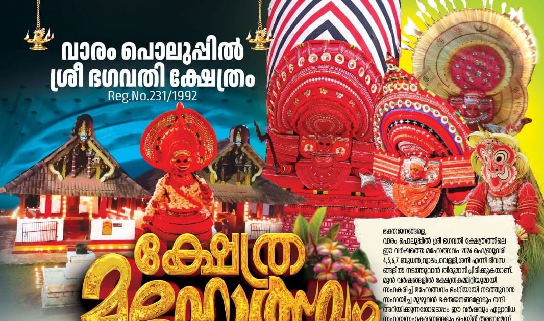 The sacred Mahotsavam 2026 at Varam Poluppil Sree Bhagavathi Temple will be observed with traditional rituals, devotional performances, and community participation. The temple, registered under Reg. No. 231/1992, continues its long-standing heritage of celebrating Bhagavathi’s divine presence through vibrant ceremonies.