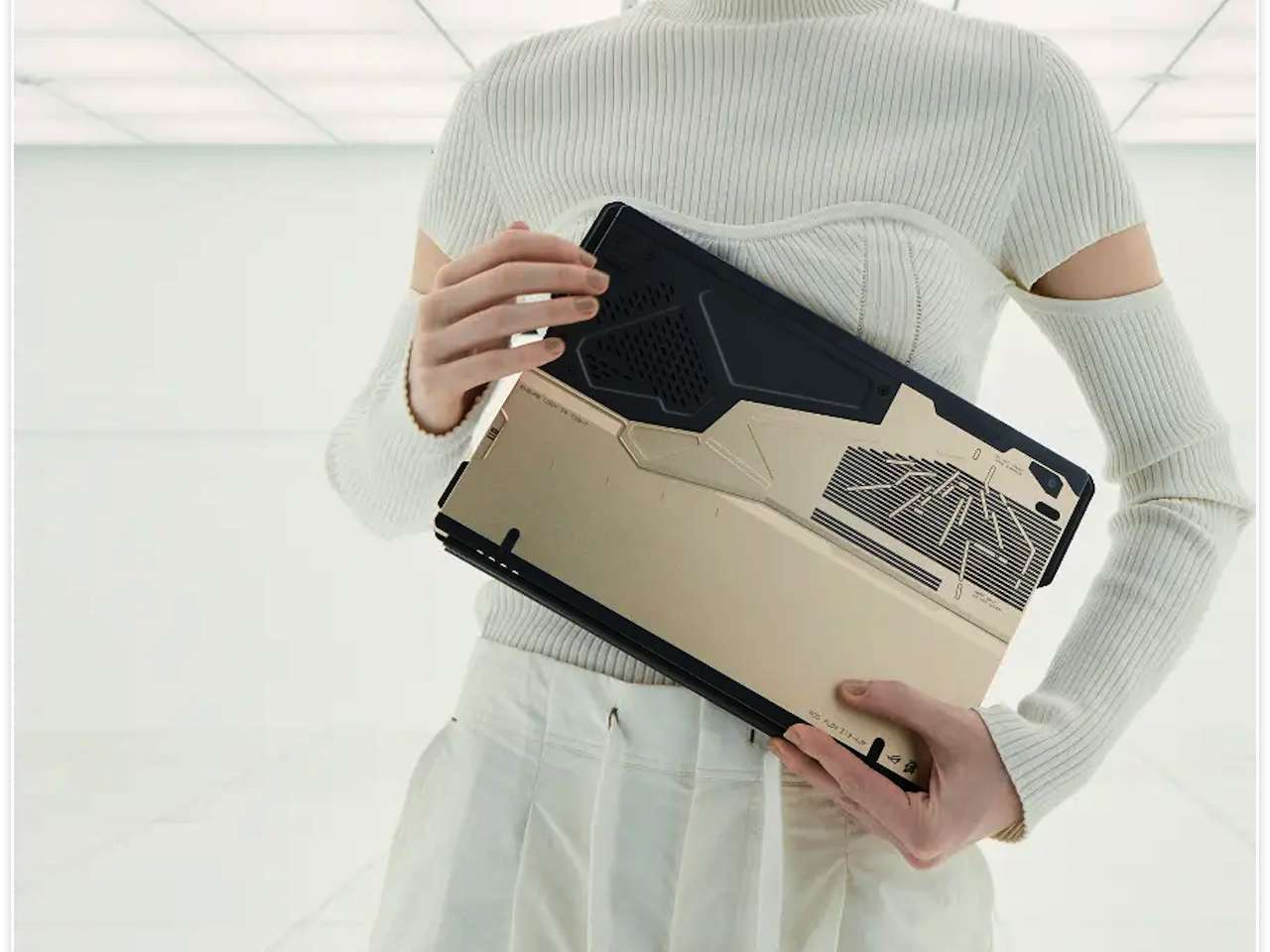 Everything shifts on the outside. Asus and Kojima Productions reworked every visible surface using the studio’s own design language. Panel lines follow the segmented armor patterns from Ludens, the armored astronaut mascot that’s represented the studio since it opened. Carbon fiber and machined aluminum alternate across the lid.