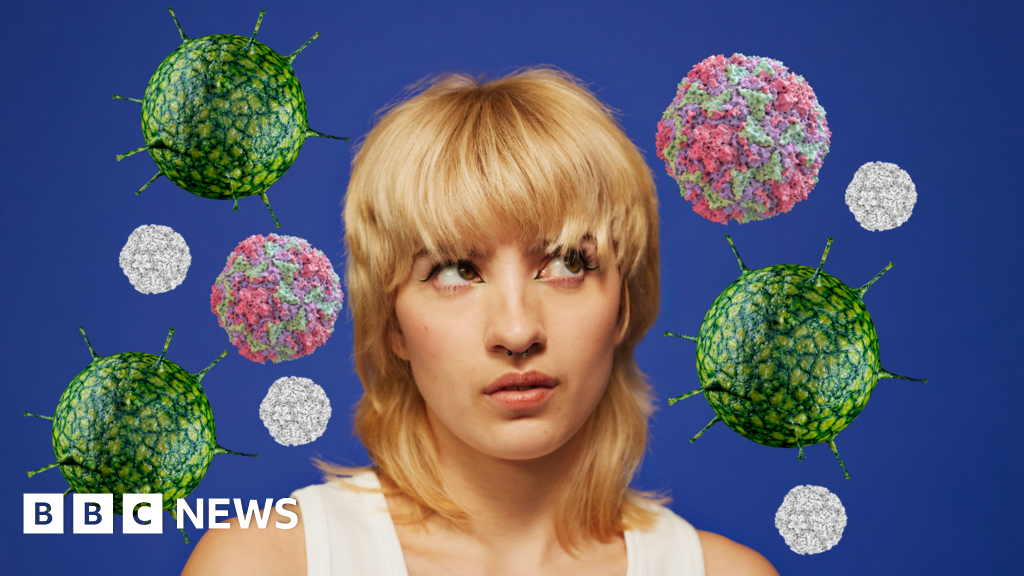 Getty Images A person with blonde hair, dressed in a white top, stands against a blue backdrop. Surrounding them are floating, orb-like structures resembling virus particles.Getty Images